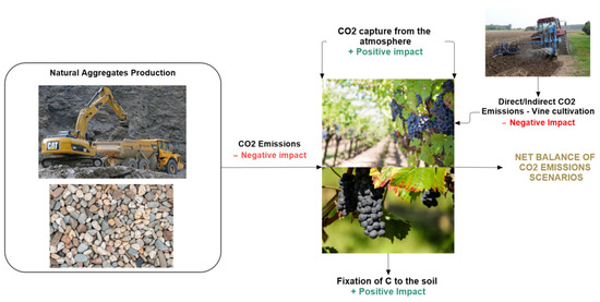 CO2 emissions balance diagram of natural aggregates production and vine cultivation.
