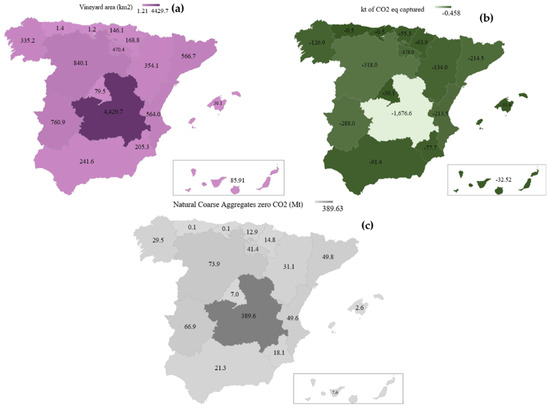 Finally, and assuming that the data on the environmental benefits of vine cultivation applied to this research refer to the Autonomous Community of La Rioja, a preliminary scenario is proposed for the national territory of Spain. Based on the areas of vine cultivation available in each territory, as well as the net value of CO2 emissions associated with vine cultivation and finally, taking into consideration the result generated in the research in which a value of 4.30 kg CO2 is emitted for each ton of NCA produced in gravel pits, we want to estimate the production of this type of aggregates that would be associated with being free of CO2 emissions in Spain. The results are shown in Figure 6, where Figure 6a shows the vineyard area (km2) for each Autonomous Community according to data from the Ministry of Agriculture, Fisheries and Food [14] as of July 2023. Figure 6b shows the net CO2 sequestration (kt CO2 eq) according to the current vineyard areas. Figure 6c shows the scenario of production of CO2-free NCA (Mt) obtained in gravel pits, taking into account the hypothesis that the entire current vineyard area would be used to mitigate the CO2 emissions associated with the production of natural coarse aggregates in gravel pits.
