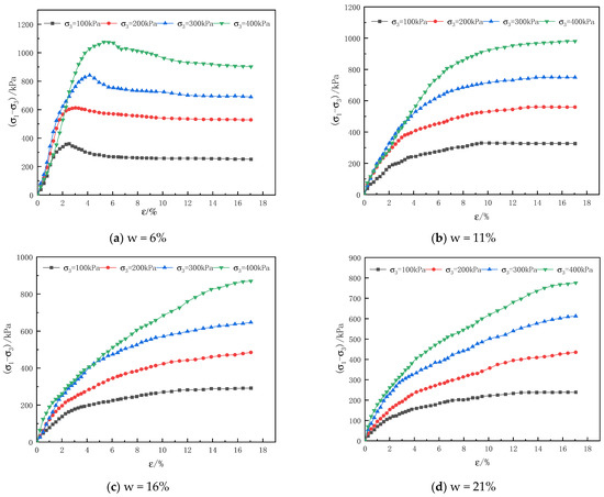 The test data were sorted and the curves of the difference in principal stress with axial strain for the undisturbed soil samples and the remolded soil samples with different moisture contents were plotted, as shown in Figure 1. The following patterns can be obtained from Figure 1.