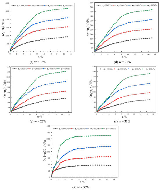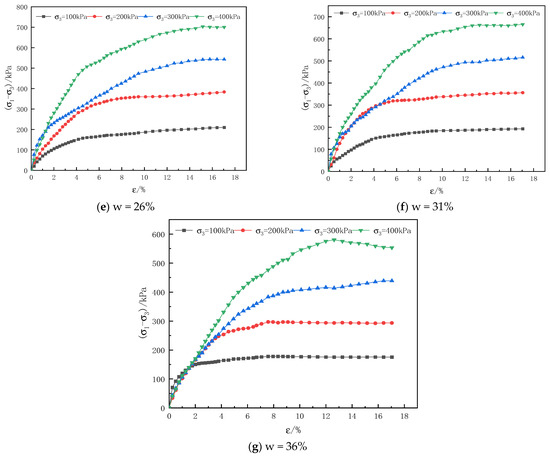(3) As can be seen from Figure 2g, the curve basically shows a trend of weak hardening. This is because the soil samples were soaked in water and disturbed, which simultaneously disrupted the connection mode, arrangement combination, and chemical action of soil particles. With the increase of axial strain, secondary structural formation gradually occurs. However, due to the excessive water content, the secondary structural strength cannot continue to increase. Therefore, as the strain increases, the principal stress difference cannot continue to grow and shows a trend of weak hardening.