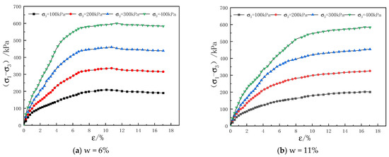 (2) When the water content is 6%, the stress-strain curve shows a strain softening type. As the confining pressure increases, the degree of strain softening in the curve gradually weakens. This is because when the confining pressure is relatively small, the structural strength of the soil mass is greater than the confining pressure. Therefore, the structural strength within the soil mass can resist the action of the confining pressure. Thus, after the soil strength reaches its peak, the loss of strength becomes more obvious. However, as the confining pressure increases, the internal structural strength of the soil gradually fails to resist the action of the confining pressure. Therefore, the soil structure will gradually deteriorate under the action of the confining pressure, and the stress-strain curve of the soil will gradually transform into a hardening type.