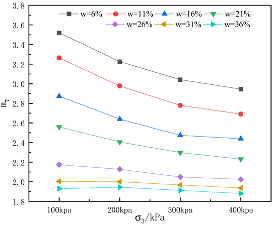 It can be seen from Figure 3 that the structural parameter of the soil samples with different moisture contents gradually decreases with the increase of the perimeter pressure. The reduction in the structural parameter is relatively large at lower boundary pressures, while the reduction in structural parameter is smaller at higher boundary pressures. The reason for this phenomenon is that when the circumferential pressure is small, the squeezing effect of the circumferential pressure on the soil samples is weaker, and the structure of the soil body is looser, so it has stronger structural properties. After the boundary pressure increases, the initial structure of the soil sample is destroyed during consolidation, i.e., the primary structure is rapidly destroyed at low strains. In the process of increasing deformation in the later stage, the internal particle arrangement and cementation structure are continuously adjusted, and the soil samples gradually form a certain secondary structure under the compacting effect of high peripheral pressure. At this time, the strength of the primary structure is reduced, but the healing of the soil structure presents a dominant role due to the formation and slow increase in strength of the secondary structure, so that the magnitude of changes in the structural parameter of soil samples after large perimeter pressures and strains is significantly reduced. In the later stages of the change, the formation of secondary structures in the soil inhibits the further weakening of the soil structural properties by the structural damage factors, allowing the parameters of the structural properties to stabilize with strain.