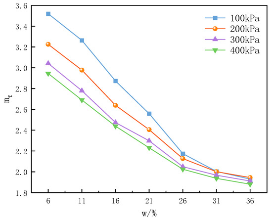 It can be seen from Figure 4 that under the condition of controlling variables, the influence law of moisture content on soil structural properties is basically similar to that of perimeter pressure on soil structural properties, i.e., the value of the structural parameter of loess gradually becomes smaller with the increase of moisture content. The structural parameter as a whole decreases with increasing moisture content, and the lower the moisture content, the higher the corresponding structural parameter at the same pressure. The magnitude of decrease in the structural parameter is greater at lower moisture content intervals, while the magnitude of change in the structural parameter decreases significantly as the moisture content increases to a saturated moisture content (36%). This suggests that for undisturbed loess, changes in moisture content have the most dramatic effect on loess structural properties at low moisture content intervals, and that a small increase in moisture content in this region can lead to a sudden decrease in loess structural properties. The structural nature of the undisturbed loess was effectively destroyed at higher moisture contents, when the sensitivity of the structural parameter to changes in moisture content and pressure was greatly reduced.
