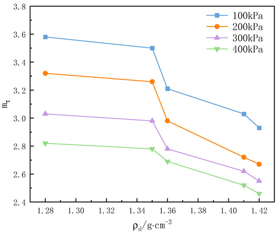 As can be seen in Figure 5, the structural parameter decreases with increasing dry density. At low circumferential pressures (100~200 kPa), the structural parameter varies more with dry density and is highly sensitive to dry density. At high circumferential pressures (300~400 kPa), the structural parameter varies less with dry density and is less sensitive to dry density. Soils with low dry density have high pore ratios, low compaction, and higher structural stability corresponding to the particle bonding characteristics and structural variability corresponding to the particle arrangement characteristics of the soil. The combined structural potential released by the soil body under load, immersion, and disturbance is large, and the loss of structural strength corresponds to a large structural parameter. When the dry density of the loess is relatively high, the loess is more stable, the variability has been relegated to a secondary position, the void between the particles of the soil body is small, and the strength of the connection between the particles is low. At this time, the particle arrangement of the soil body is in a relatively stable state and the loess is weakly structured, corresponding to a small structural parameter. Overall, changes in loess dry density have a greater effect on loess structural variability than on stability. Therefore, with the increase of dry density, the weakening of structural variability is greater than the strengthening of structural stabilization in the corresponding situation, and the structural properties of loess are also weakened from strong to weak accordingly.