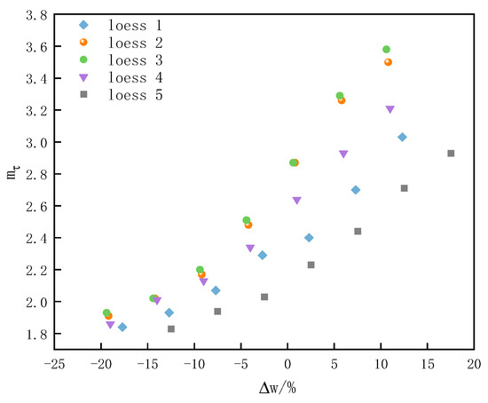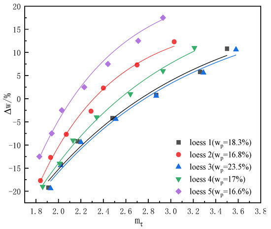 Based on the test results of the structural parameter with moisture content in Section 3.2.2, the relationship between and moisture content difference was analyzed, as shown in Figure 7. The pattern of change of structural parameters with moisture content difference for different depths of Weinan loess samples from loess 1 to loess 5 shown in Figure 7 is approximately the same. The greater the difference between the plastic limit and the moisture content, the greater the value of ; conversely, the smaller the value of . When the moisture content is less than the plastic limit, the value of the structural parameter of loess is greater. The lower the plastic limit of the soil sample, the larger the slope of the change curve of moisture content difference with structural parameters, and the smaller the range of structural parameters. On the contrary, the smaller the slope of the change curve of moisture content difference with structural parameters, the smaller and larger the change range of structural parameters.