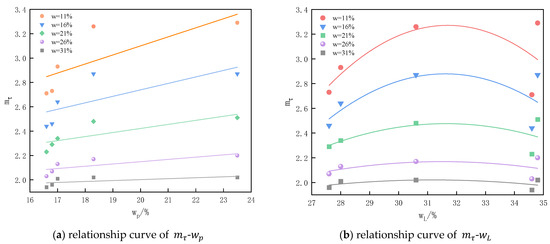 To consider the effect of plastic limit and liquid limit on the structural properties, the test results of the variation of the structural parameters of plastic limit and liquid limit soils under different moisture content conditions are analyzed in Figure 9. It can be seen from Figure 9a that the structural parameters of loess generally show a monotonically increasing rule of change with increasing plastic limit. As can be seen from Figure 9b, the increase of liquid limit of structural parameters presents a non-monotonic change rule.