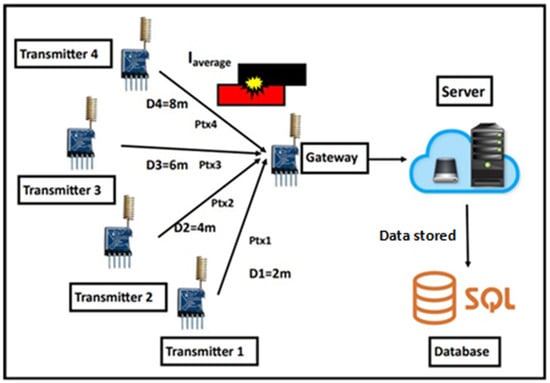 The experimental setup consists of four transmitters, a gateway, and a server. The transmitters are responsible for collecting and sending data to the gateway. The gateway processes the received data and forwards them to the server for further analysis and storage.