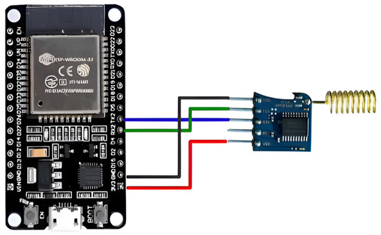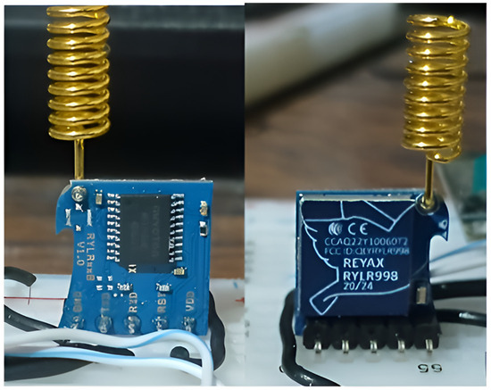 For experimentation, the ESP32 development board was utilized as the central component due to its versatility, ease of communication with peripheral modules, affordability, and low power consumption. The ESP32, a widely popular microcontroller, integrates both Wi-Fi and Bluetooth capabilities, making it an ideal choice for IoT applications where connectivity is crucial [27,28]. Its dual-core Tensilica Xtensa LX6 processor, running at a clock speed of up to 240 MHz, provides sufficient computational power to handle real-time data processing and communication tasks [29,30]. Furthermore, the ESP32 ultra-low power consumption in deep-sleep mode, typically around 10 µA, ensures energy efficiency, which is a critical requirement in scenarios involving battery-powered LoRa devices [31,32]. In this experimental setup, the ESP32 development board was utilized as the central component, and to facilitate long-range communication, the Reyax RYLR998 (Taipei City, Taiwan) LoRa module was employed as the transmitter (Figure 2 shows the transmitter used). This module operates on the LoRa modulation technique, known for its robust long-range communication capabilities and superior resistance to interference [33,34]. The RYLR998 supports frequencies ranging from 868 MHz to 915 MHz, making it compatible with unlicensed ISM bands in various regions [35,36]. It boasts a transmission range of up to 15 km in optimal conditions, making it suitable for applications in smart cities, agricultural monitoring, and remote sensing [37,38]. Additionally, the module features an easy-to-use UART interface, simplifying integration with microcontrollers such as the ESP32. Its built-in commands for setting transmission power, spreading factor, and other parameters enable flexible configuration, essential for adapting to varying network conditions [39]. The experimental setup also included a single-channel LoRa gateway, configured to operate at a frequency of 915 MHz to ensure compatibility with the Reyax RYLR998 module. This gateway was used to facilitate communication between the transmitter and the network, enabling the evaluation of packet loss and interference under controlled conditions. The choice of the Reyax RYLR998 module, instead of utilizing the LoRa functionality integrated into certain ESP32 boards (e.g., Heltec or TTGO models), was motivated by several factors. Firstly, the RYLR998 module provides a simplified AT command interface, which streamlines configuration and facilitates direct control over critical parameters such as transmission power and spreading factor. Secondly, using an external module offers greater flexibility for expanding the experimental setup, as it allows for interoperability with other microcontroller platforms beyond the ESP32. Additionally, this approach ensures consistency and reproducibility in experiments, as the RYLR998 module is widely adopted and provides standardized hardware performance. These considerations were critical for accurately validating the probabilistic model proposed in this study and ensuring its applicability to a broad range of LoRa network scenarios. The experimental setup was designed to utilize relatively short distances between the transmitter and the gateway, which may appear counterintuitive given that the long-range (LoRa) technology is being evaluated. However, this choice was intentional to ensure precise control over the environmental and interference factors affecting the communication. Testing under short-distance conditions allows for a more detailed and accurate analysis of key parameters such as packet loss, signal-to-interference ratio (SIR), and aggregated interference power (Iaverage). These controlled results can then be extrapolated to long-distance scenarios, as the LoRa signal propagation characteristics, governed by the path loss model and environmental conditions, remain consistent regardless of the physical distance. By focusing on short distances, this study isolates and evaluates the fundamental behavior of the proposed probabilistic model, providing a robust foundation for its application in scenarios requiring extended communication ranges, such as smart agriculture or wide-area sensor networks. Future work could validate these findings further by extending the experiments to real-world deployments over longer distances, incorporating additional environmental complexities to confirm scalability.