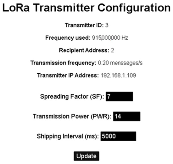 In the experimental setup shown in Figure 3, the ESP32 was mounted on a protoboard to construct the circuit. The circuit was distributed across four separate protoboards to demonstrate the experiment effectively. The ESP32 was programmed to function as a server, enabling seamless communication and configuration of the Reyax RYLR998 modules. A custom real-time interface was developed to dynamically adjust key transmission parameters, including spreading factor, bandwidth, and power levels. This system, illustrated in Figure 4, displays all the parameters measured during the experiment. The interface not only streamlined the configuration process but also facilitated rapid prototyping and testing of various communication scenarios, enhancing the overall experimental efficiency and adaptability.