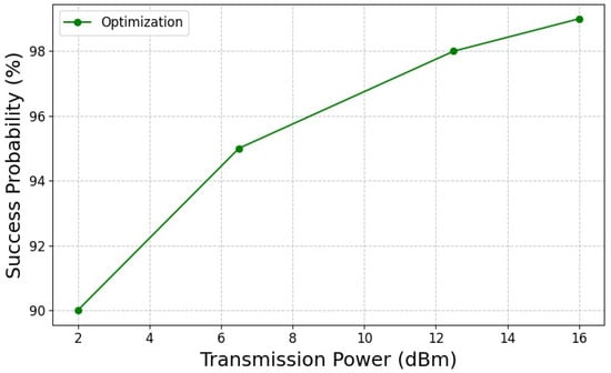 Transmitters 1 and 3 exhibited an identical performance, each successfully transmitting 63 data points with a success probability of 87.5% and achieving average RSSI values of −43 dBm and −41 dBm, respectively. These values indicate a relatively high level of reliability, although some packet losses occurred due to interference or other factors such as path loss variability. The consistency in their performance suggests that the experimental setup provided stable conditions, allowing these devices to operate with comparable efficiency. On the other hand, transmitters 4 and 5 demonstrated optimal performance, achieving a 100% success probability by transmitting 72 data points each without any packet losses. Their respective average RSSI values, −47 dBm and −46 dBm, reflect strong and stable signal strengths at the receiver. The superior performance of these transmitters could be attributed to several factors, including their proximity to the gateway, favorable environmental conditions, or reduced interference during their operation. These observations underscore the potential of carefully calibrated transmission parameters to maximize network reliability. The data from the table confirm that the model’s predicted success probabilities tended to overestimate the actual outcomes, particularly for transmitters 1 and 3. Despite this, the model still enabled the system to achieve high reliability, with most packets being successfully transmitted as expected. This slight overestimation suggests room for refinement in the interference and path loss modeling, especially under varying network densities or environmental conditions. The results also highlight the relationship between success probability and the average RSSI values. Transmitters with lower RSSI values (e.g., transmitters 4 and 5) achieved perfect success rates, emphasizing the robustness of the LoRa modulation scheme even under conditions of moderate signal attenuation. This finding aligns with the theoretical expectations of LoRa technology, where its inherent resistance to interference allows for reliable communication over extended ranges. From a broader perspective, these findings reinforce the importance of optimizing transmission parameters, such as power levels and spreading factors, to adapt to the specific conditions of a network deployment. By tuning these parameters, the system can achieve higher reliability while minimizing energy consumption, an essential consideration for IoT applications. In conclusion, the table demonstrates the effectiveness of the proposed model in maintaining high success probabilities across all tested transmitters. While there is room for further refinement of the model to reduce overestimation, the results validate its applicability for real-world LoRa deployments. Future experiments could expand on these findings by testing in environments with higher node densities, increased interference, or greater distances from the gateway to further evaluate the robustness of the model and the network’s scalability. Figure 5 depicts the relationship between transmission power (measured in dBm) and the success probability of transmitted packets (expressed as a percentage). This graph provides critical insights into the effect of varying transmission power on the reliability of the communication in the experimental setup described in the article.