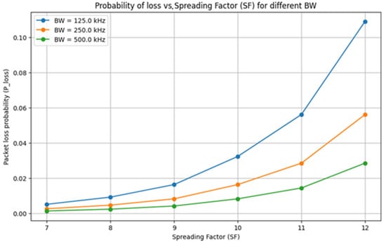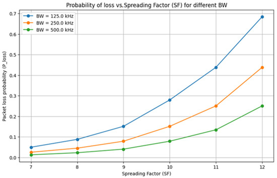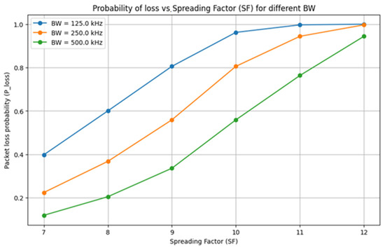 The trend shown in Figure 5 is a clear positive correlation between transmission power and success probability. At the lowest transmission power of 2 dBm, the success probability is approximately 90%. This relatively low value suggests that at minimal transmission power levels, factors such as path loss, interference, and signal attenuation significantly reduce the likelihood of successful packet delivery. However, as the transmission power increases, the success probability also rises, indicating improved reliability of the communication link. At a transmission power of 6 dBm, the success probability increases to around 94%. This marks a notable improvement, demonstrating that even a moderate increase in power can enhance the robustness of the communication link. The improvement in success probability between 6 dBm and 12 dBm is similarly pronounced, with the success rate reaching approximately 96%. This further supports the hypothesis that higher transmission power mitigates the negative effects of environmental factors and interference on packet delivery. At the highest transmission power level of 16 dBm, the success probability in LoRa-based networks reaches near-optimal performance, approaching 98%, demonstrating the reliability of the LoRa modulation scheme under elevated power levels and the model’s ability to optimize communication parameters for maximum efficiency. However, the diminishing returns observed between 12 dBm and 16 dBm suggest a threshold beyond which further increases in transmission power provide minimal improvements in success probability. This insight underscores the importance of balancing transmission power with other critical factors such as energy consumption and network scalability. While higher transmission power enhances success probability, it also increases energy usage, which is a significant consideration for battery-powered IoT applications. The ability to achieve a success probability of 94–96% at moderate power levels (e.g., 6–12 dBm) highlights an optimal range where reliability and energy efficiency are balanced. This trend aligns with theoretical models of wireless communication, where received signal strength is proportional to transmission power under constant conditions, but it also reveals the influence of environmental factors and interference, as evidenced by the sub-optimal success probability at lower power levels. These findings emphasize the critical role of transmission power selection in LoRa-based networks, particularly for ensuring reliable communication over long distances or in challenging environments with high interference levels. In addition to transmission power, other key parameters such as the spreading factor (SF), bandwidth (BW), and Time on Air (ToA) also play a crucial role in determining the reliability and efficiency of LoRa networks. Figure 6 and Figure 7 illustrate the relationship between the probability of packet loss and key LoRa network parameters, specifically the spreading factor (SF), bandwidth (BW), and Time on Air (ToA). These parameters play a critical role in determining the reliability and efficiency of LoRa communications, particularly in dense network deployments where interference and packet collisions are more likely to occur. In Figure 6, the probability of packet loss is plotted against the spreading factor (SF) for different bandwidth (BW) values. The results show that as the SF increases, the Time on Air (ToA) also increases significantly. This is because a higher SF results in longer symbol durations, which extends the transmission time of each packet. As a consequence, packets are more exposed to potential interference from other transmissions, leading to a higher probability of packet loss. For example, at SF = 12 and BW = 125 kHz, the probability of packet loss is notably higher compared to SF = 7 under the same BW. This trend is consistent across all BW values, although the impact is more pronounced at narrower bandwidths (e.g., 125 kHz) due to the longer ToA. On the other hand, Figure 7 demonstrates how the bandwidth (BW) influences the probability of packet loss. A wider BW reduces the ToA, as data can be transmitted at a faster rate. This reduction in transmission time decreases the likelihood of packet collisions, thereby lowering the probability of packet loss. For instance, at BW = 500 kHz, the probability of packet loss is significantly lower compared to BW = 125 kHz, especially for higher SF values. However, it is important to note that while a wider BW improves transmission efficiency, it also reduces the receiver’s sensitivity. This trade-off may require higher transmission power to maintain reliable communication over longer distances or in environments with higher noise levels. Additionally, the impact of the packet arrival rate (λ) on network performance is evident in these results. As λ increases, the network experiences higher traffic loads, leading to more frequent packet collisions and a higher probability of packet loss. This effect is particularly noticeable in scenarios with longer ToA, such as those with higher SF values or narrower BW. For example, at λ = 1 packets per second, the probability of packet loss is significantly higher compared to λ = 0.1 packets per second, especially for SF = 12 and BW = 125 kHz as it is seen in Figure 8 and Figure 9 compared to Figure 10 and Figure 11. These findings underscore the importance of carefully selecting and balancing SF, BW, and transmission power to optimize LoRa network performance. In environments with high node density or high traffic loads, using a lower SF and a wider BW can help reduce the ToA and minimize packet collisions. However, in scenarios where long-range communication or higher receiver sensitivity is required, a higher SF and narrower BW may be necessary, despite the increased risk of packet loss. Adaptive algorithms that dynamically adjust these parameters based on real-time network conditions cou