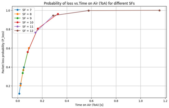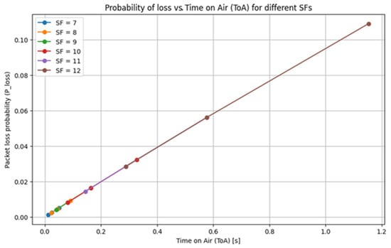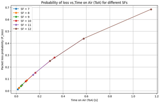 The graph shows the relationship between packet loss probability () and time on air (ToA) for different spreading factors (SF) with λ = 1.