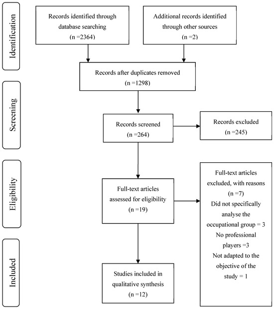 A total of 2364 (i.e., PubMed: 588, Web of Sciences: 1128, Scopus: 650) original articles were initially retrieved from the mentioned databases. These studies were then exported to the reference management software (Zotero 7.0), and duplicates (1068 items) were automatically removed. Thus, a total of 1296 original articles were found. After this, a total of 1279 articles checked by title and abstract were excluded. In addition, two articles from additional sources were included. The remaining nineteen articles were checked in full text, leading to the exclusion of seven articles: three for not specifically analyzing the professional group, two for not having professional players, one for not adapting to the objective of the study, and one for not having the text available. A total of twelve articles met all the inclusion criteria and were finally included in the qualitative synthesis. All the steps followed for the selection of the articles are presented in Figure 1.