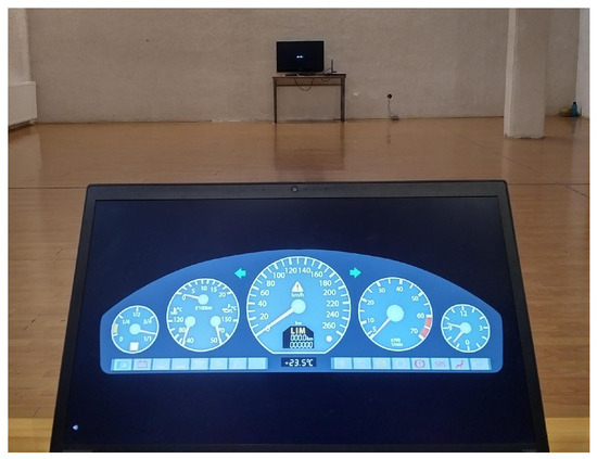 The monitor was positioned at a distance of 11 m from the table where the participants were sitting (Figure 1 and Figure 2). The monitor was Grundig Vision 9 32-9970 T/C, 32 inch Active Matrix TFT LCD screen and a resolution of 1920 × 1080. The monitor was used as a target to keep the participants’ gaze ahead before reading the instrument cluster.