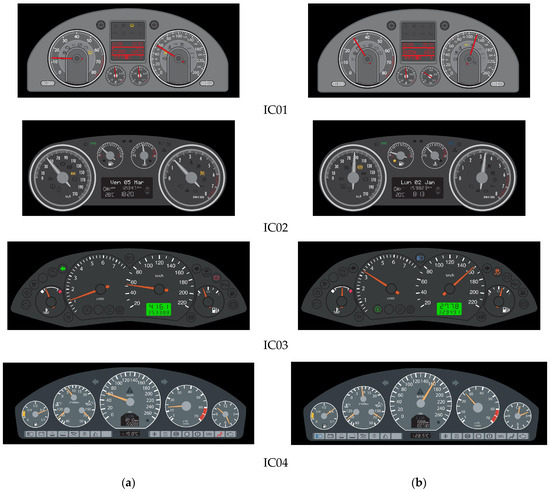 Classic-style instrument clusters (IC no. 1 to 4 in Table 1), set to medium speed (a) and higher speed (b).