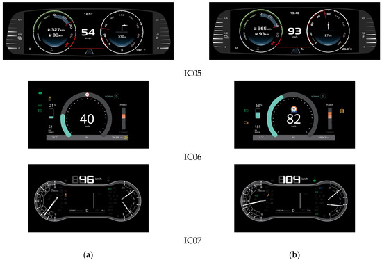 Modern-style instrument clusters (IC no. 5 to 7 in Table 1), set to medium speed (a) and higher speed (b).