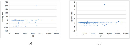 Relationship between RT and reading error (a), and between RT and relative reading error (b).