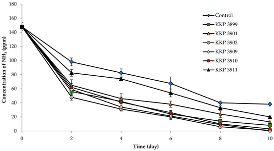 The results showed that for Bacillus bacteria, strains KKP 3899, KKP 3901, and KKP 3903 had a strong ability to remove ammonia. In our study, the highest ammonia removal rate was reported on Day 2 of the process. As shown in Figure 2 and Table 4, the KKP 3899, KKP 3901, and KKP 3903 strains showed NH3 removal efficiencies of 43% (148–56 ppm), 34% (148–65 ppm), and 51% (148–48 ppm), respectively, under the closed system at ambient temperature 24 °C (R1-reduction compared to the control sample).