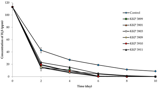 Based on the results, it was found that the highest H2S reduction was observed similarly to ammonia on Day 2 of the deodorization process. For all selected microorganisms, the hydrogen sulfide reduction compared to the initial sample (R2—reduction) ranged from 14 to 23.1 ppm, thereby achieving an 80–88% removal efficiency. On Day 4 of the process, hydrogen sulfide was reduced from 113 ppm to 6.4 ppm for KKP 3903, 7.2 ppm for KKP 3909, 8.8 ppm for KKP 3901, 9.0 ppm for KKP 3910, and 9.4 ppm for KKP 3897. Only three strains achieved values higher than 10 ppm: KKP 3905 (10.1 ppm), KKP 3809 (11.1 ppm), and KKP 3902 (17.9 ppm). The H2S reduction achieved then was 87–94% compared to the initial sample (R2—reduction) and 50–76% compared to the control sample (average concentration was 27.2 ppm).