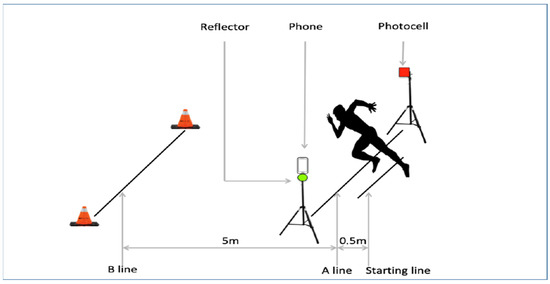 Each participant performed four 5 + 5 m tests according to the procedures described by Moreno-Azze et al. [40]. All tests were recorded simultaneously using photoelectric cells (Microgate, Bolzano, Italy) and a high-speed camera on an iPhone SE (Apple Inc., Cupertino, CA, USA). Participants were instructed to refrain from engaging in intense physical activity on the day prior to the scheduled test. Data from the two instruments were collected between 16 h and 18 h, a temperature of 20 °C and a humidity between 52% and 63%. The reliability and validity of the mobile application were analyzed subsequently.