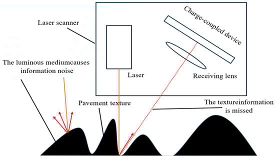 With the development of digital image processing technology and computational processing technology, scholars at home and abroad take advantage of the emerging high-precision equipment to obtain the texture data of the pavement surface and are equipped with software such as MATLAB and Python to realize the efficient processing and computation of the pavement surface texture data [22,23]. Python and other software can realize the efficient processing and calculation of pavement texture data, of which the acquisition method of pavement surface texture currently has a close-up photography system, such as a laser scanner (the principle is shown in Figure 1); after acquiring the pavement texture data, an X-ray CT scanning system is used for data processing to complete the three-dimensional reconstruction of the pavement texture, and then the calculation of pavement texture indexes is conducted to complete the evaluation of the road surface skid resistance [24].