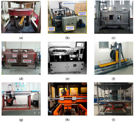 Abrasion equipment. (a) Indoor accelerated abrasion tester [62]; (b) tire–pavement dynamic friction analyzer [57]; (c) MMLS3 accelerated loading tester [7]; (d) MLS11 accelerated loading tester [63]; (e) aggregate friction characterization tester [59]; (f) six-wheeled accelerated abrasion machine [64]; (g) multiple accelerated abrasion machinic (MAAM) [65]; (h) kneading machine [58]; (i) three-wheel polishing device [66].