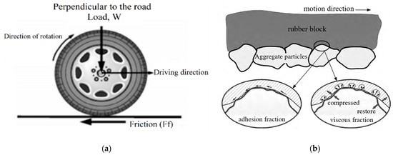 Schematic of tire–pavement contact interface model and friction composition. (a) Schematic of model of tire–pavement contact interface [73]; (b) schematic diagram of tire–road friction components [25].