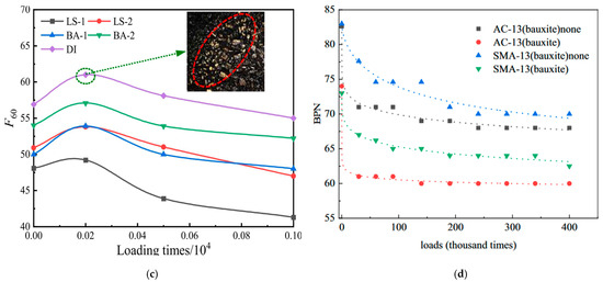 Bitumen is a kind of mineral oil which is separated, purified, and concentrated from residual oil, and it has a certain degree of adhesion and viscosity [74]. Bitumen plays the role of bonding aggregates in the mixture so that the aggregates can be effectively combined, and good adhesion and water stabilization can ensure that the skid resistance of the pavement will not be reduced due to the spalling of the aggregates and the occurrence of various water damages [75]. In addition, the impact of the amount of asphalt on the skid resistance of asphalt concrete pavement is also obvious. When the asphalt content of AP is less, it cannot wrap aggregates well and aggregates are prone to loosen, resulting in a decline in the skid resistance of the road surface [76]. If the amount of asphalt is too large, there will be a large amount of free asphalt in the mixture, resulting in an “oil flooding” phenomenon [77]. This leads to the occurrence of coarse aggregate relative sliding, reducing the stability of the mixture, while the free asphalt generated by oil flooding will fill the surface micro-textures of the coarse aggregate on the pavement, reducing the skid resistance of the pavement [78]. And on rainy days, if the rainwater on the surface cannot be discharged in a timely manner, it will affect the safety of the vehicle. However, while low asphalt content may lead to aggregate loss, the relationship between asphalt content and skid resistance is more complex. Low asphalt content may initially expose more aggregate, increasing macro-texture and skid resistance, while long-term aggregate polishing can reduce friction. Conversely, high asphalt content may lead to excessive coverage of aggregates, reducing macro-texture.