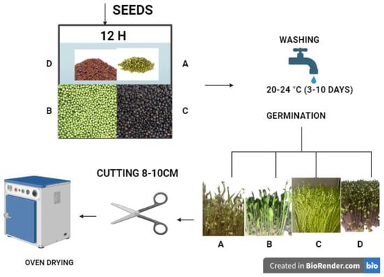 Technological flow for obtaining sprouts. Figure created with BioRender.com, accessed on 29 December 2024. (A) beans (Phaseolus vulgaris); (B) peas (Pisum sativum); (C) black lentils (Lens culinaris), and (D) radish (Raphanus sativus L.).
