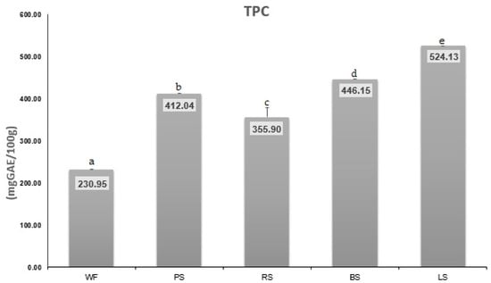 Figure 4 presents the TPC composition, while Figure 5 illustrates the increase in TPC compared to the control (WF). Table 1 provides the content of individual polyphenols.
