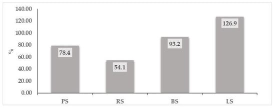 Figure 7 shows the percentage of inhibition of the analyzed extracts at the maximum concentration applied (100 µL/mL, against the two sensitive strains (S. aureus and E. faecalis) and shows the relation to the effect produced by the positive control antibiotic for which the maximum inhibition is considered. A high percentage of S. aureus inhibition of over 75% is observed with the application of three of the total four analyzed sprouts (PS, LS, RS) and an 87.5% inhibition efficacy against E. faecalis for the RS extract, respectively.