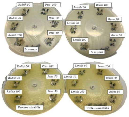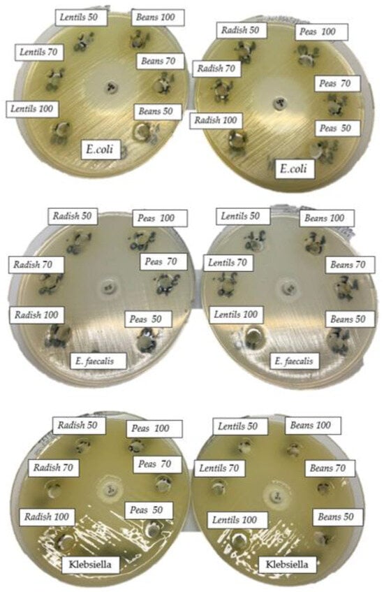 The antimicrobial properties of germinated seeds from the Fabaceae and Brassicaceae families result from the presence of bioactive compounds produced during the germination process [11]. These compounds, such as polyphenols, flavonoids, and glucosinolates, demonstrate the ability to inhibit the growth of pathogenic bacteria, offering a natural alternative to synthetic antibiotics [11]. The antimicrobial activity of legumes against both Gram-positive and Gram-negative bacteria, including pathogens such as Staphylococcus aureus, Escherichia coli, Proteus mirabilis, and Klebsiella pneumoniae, was reported [12]. Pina-Pérez et al., 2018 explained that the antimicrobial potential of these extracts can be attributed to the protease inhibitors, which inhibit the protease secreted by microorganisms [12]. Among cruciferous vegetables, sprouted radishes are effective against bacteria and fungi due to sulfur compounds [13]. The study of the antibacterial effect of vegetable sprouts against human pathogens showed that sprouted radish, kohlrabi, and red cabbage exhibited inhibitory zones against Escherichia coli, Salmonella Typhimurium, Shigella flexneri, Proteus mirabilis, Klebsiella pneumoniae, Pseudomonas aeruginosa, and Staphylococcus aureus [14].