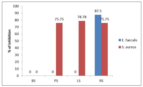 The percentage of inhibition of the analyzed extracts, at the maximum concentration applied (100 µL/mL), against the 2 sensitive strains (S. aureus and E. faecalis). PS—pea sprouts, RS—radish sprouts, BS—bean sprouts, LS—lentil sprouts.
