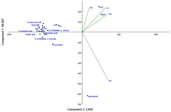 TPC aligns strongly with Mg and LS/BS samples, highlighting a robust association between total polyphenols and magnesium concentrations in these samples. Resveratrol and quercitin are closely positioned near TPC, indicating their significant contribution to the total polyphenol content. These compounds are widely recognized for their potent antioxidant and antimicrobial activities.