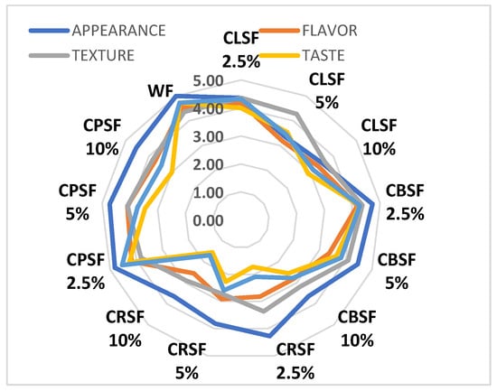 The analysis of data presented in Figure 10 shows that the control sample obtained only from wheat flour is the most appreciated product, achieving the highest scores: 5.00 ± 0; 4.55 ± 0.52; 4.36 ± 0.67; 4.73 ± 0.65; 4.73 ± 0.65 for appearance, aroma, texture, taste, and overall acceptability, respectively. This product was the most preferred by consumers. Among the analyzed germinated samples, it was observed that CPSF 2.5% (4.82 ± 0.40; 4.18 ± 0.60; 3.82 ± 0.75; 4.27 ± 0.47; 4.55 ± 0.52) and CBSF 2.5% (4.73 ± 0.47; 4.18 ± 0.60; 4.36 ± 0.67; 4.27 ± 0.65; 4.27 ± 0.47) received scores close to control, indicating they were also well-liked by consumers.
