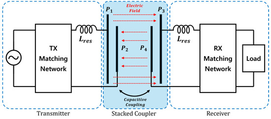 Figure 1 shows the configuration of a stacked CPT for wireless power transfer underwater. Copper plates , , , and are vertically stacked to implement a stacked structure, and the copper plates are connected to the transmitter and receiver sides, respectively. Generally, the large area plates (P1, P3) are called back plates, and the small area plates (P2, P4) are called front plates. The current generated by AC voltage passes through the matching network and the resonant inductor and generates an electric field in the water. The transmitter and receiver are electrically connected through electric field coupling, and power transfer between the transmitter and receiver is possible. The red dotted line shows the direction of the current for the generated electric field. The matching network is essential for implementing a high efficiency wireless power transfer system because it can minimize the power reflected from the receiver by matching the impedances of the transmitter and receiver.