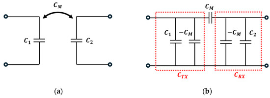 In order to design an appropriate matching network, it is necessary to obtain an equivalent circuit to the represent coupler. As shown in Figure 2a, the general capacitive coupler can be expressed by mutual capacitance and equivalent capacitances and on both sides. Since a total of six electric field couplings can be generated in a four-plate CPT coupler, the equivalent capacitance components and mutual capacitance can be represented as six electric field couplings using Equation (1).