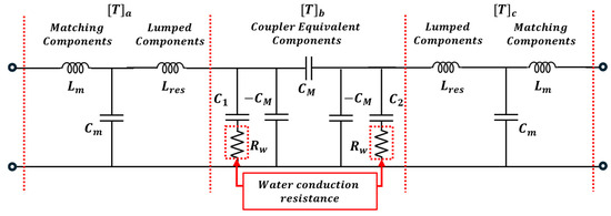 Figure 3 shows the practical equivalent circuit (PEC) model of the underwater stacked CPT system proposed in this study. For proper resonance, the LCL-matching method was applied to the transmitter and receiver. Since the transmitter and receiver of the coupler are designed with the same specifications, all matching elements and lumped elements used in this study are symmetrical. and represent the components of the inductor and capacitor from the matching network, and represents the lumped inductor component to resonate the system at the desired frequency.