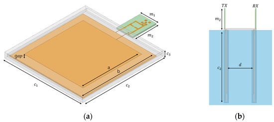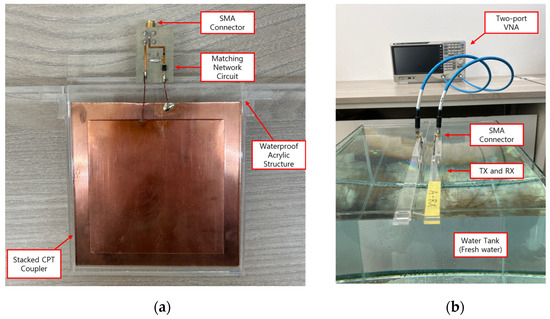 Figure 4 shows the design of the underwater stacked CPT coupler proposed in this study. As shown in Figure 4a, the square front plate and back plate are separated by a gap of 2 mm to implement a stacked structure, and the lengths of the plates are 80 mm and 100 mm, respectively. In order to prevent direct contact between water and the copper plate, the stacked structure is placed inside an acrylic box, and the width, length, and height of the acrylic box are 105 mm, 110 mm, and 7.5 mm, respectively. The detailed parameters of the proposed underwater stacked CPT coupler are shown in Table 2. As shown in Figure 4b, the transmitter and receiver with the same configuration are positioned facing each other underwater. In this study, the distance between the transmitter and receiver is considered from 10 mm to 200 mm.