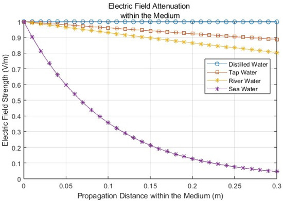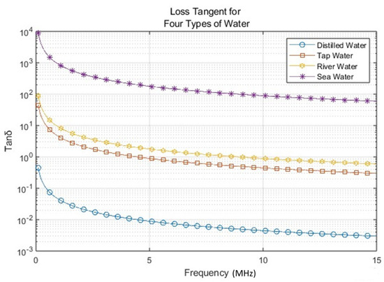 Figure 6 shows the loss tangent values in the frequency range from 0.1 MHz to 15 MHz. The loss tangent was calculated for four types of water, and their conductivities and relative permittivities are shown in Table 3. As shown in Figure 6, the loss tangent of distilled water is much less than 1 in all frequency bands in which the CPT system operated and can be evaluated as good dielectric material. The loss tangent of tap water and river water, in which some electrolytes are dissolved, can have both conductive and dielectric properties depending on the operating frequency. According to Figure 6, tap water can be considered as a dielectric material above a frequency of about 5 MHz, and river water can be considered as a dielectric material above a frequency of about 8 MHz. However, even if both media are considered as dielectric materials, it is clear that they have high losses in the MHz band. Since dielectrics are generally defined as , both mediums are included in the category of conductors unless they are used at higher frequencies. Unlike the previous three types of water, the loss tangent of seawater greatly exceeds 1 in all frequency bands in which the CPT system operated and can be evaluated as a good conductor. This indicates that electromagnetic fields propagating in seawater media cause much larger conduction losses than other types of water. As can be seen in Equation (9a) in the previous section, the strength of the electric field within the medium exponentially decreases according to the propagation distance due to the attenuation constant , which is the real part of the propagation constant .