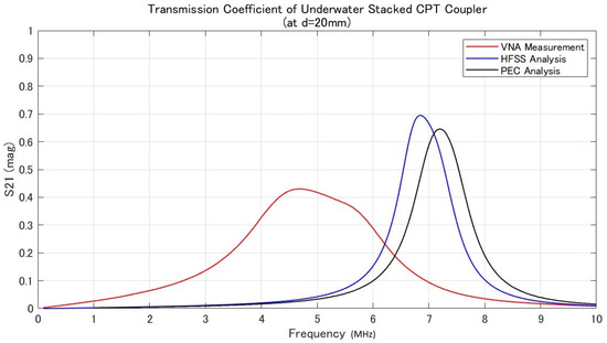 In this section, we compare and analyze the VNA measurement results, HFSS simulation results, and PEC analysis results of the underwater stacked CPT coupler. Figure 8 shows the parameters obtained using three methods when the distance between the transmitter and receiver is 20 mm. As mentioned before, all the circuit components used in the PEC analysis are measured values of passive components and coupler configurations in an RLC meter, so they reflect the non-ideal characteristics of the components. Nevertheless, the HFSS electromagnetic simulation results show very similar trends to the PEC analysis results, which indicate that the simulation was properly performed.