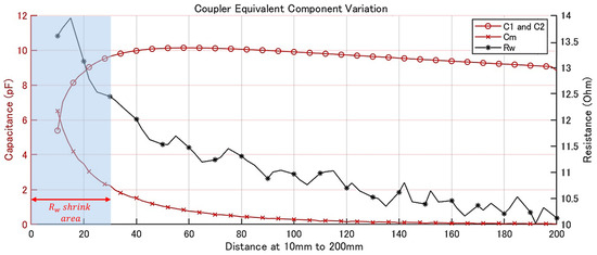 Figure 9 shows the change in coupler equivalent components when the distance between the transmitter and receiver is swept from 10 mm to 200 mm. Since the transmitter and receiver have the same specifications, the sizes of and are the same. When the distance between the transmitter and receiver is 10 mm, and have a low value of about 5.8 pF, but sharply increased to about 10 pF until 50 mm. After 50 mm, it shows a gradual decrease to 200 mm. In the case of , however, it has the highest value of about 6.4 pF at 10 mm, but exponentially decreases to about 0.2 pF until 100 mm. After 100 mm, is close to 0, and the coupling between the transmitter and receiver almost disappeared. is the parameter that was most sensitive to water shaking during the measurement process of the RLC meter. Unlike the capacitance component of the coupler, it shows relatively unstable variation. has a maximum value of 14 ohm at 20 mm, and gradually decreases to about 10 ohm as the distance between the transmitter and receiver increases.