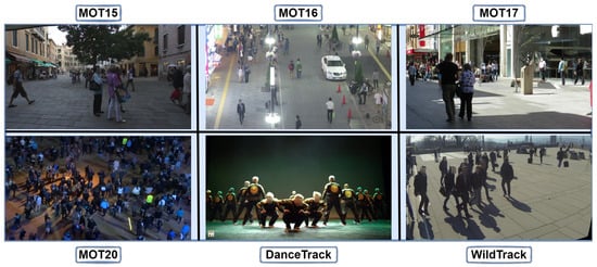 The diverse and challenging environments captured in the MOT15, MOT16, MOT17, MOT20, DanceTrack, and WildTrack datasets are illustrated in Figure 1, further highlighting the importance of using diverse datasets to evaluate the performance of MOT algorithms since they encompass a broad spectrum of challenges, from standard urban environments to extreme conditions.
