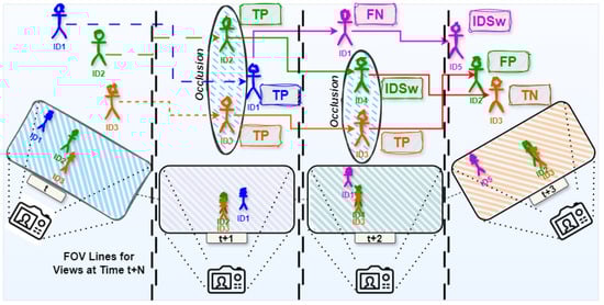 In the first frame (t), three individuals (ID1, ID2, and ID3) are correctly detected. In the next frame (), ID1 and ID3 are still tracked (TP), but ID2 is occluded or exits, causing a false negative (FN). A new individual (ID4) enters but is mistakenly identified as ID2, leading to an IDSw. By the third frame (), ID1 is missed (FN), ID3 remains correctly tracked (TP), and ID2 reappears but is confused with ID5, causing another IDSw. Additionally, ID5 is falsely introduced (FP), while ID4 is correctly tracked, reflecting a true negative (TN). This highlights how IDSws, FNs, and FPs degrade tracking, especially in dynamic, crowded scenes.