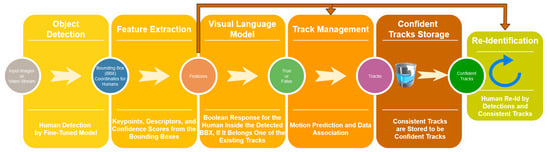 The proposed MOT flow diagram depicting the integration of object detection, feature extraction, visual language modeling, track management, confident track storage, and re-id modules to achieve robust and accurate tracking of humans in real-world scenarios. The flow diagram addresses key challenges such as IDsws, occlusions, and the need for robust feature utilization, resulting in a more reliable and scalable MOT solution.