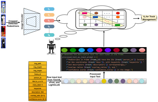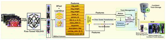 ReTrackVLM is designed to overcome the persistent challenges encountered in real-world tracking scenarios, integrating VLMs and a novel embedding structure. As can be seen in Figure 4, the operation procedure of ReTrackVLM starts with fine-tuned YOLOv8 [53] detecting pedestrians in input images, followed by feature extraction using XFeat and LightGlue, which generate robust descriptors and keypoints for each bbx. These features are processed through an image encoder and text embedder, then fused using a fine-tuned transformer to predict motion and manage data association. The track management module ensures accurate tracking by predicting movements and refining appearance descriptors. High-confidence tracks are stored in a dedicated database for ReID, allowing the system to maintain track continuity even in challenging scenarios such as occlusions and complex motions. This combination of modules improves the accuracy of the tracking and reduces IDSws across various datasets.