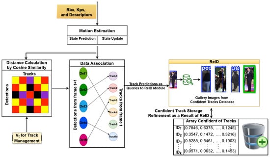 The track management and zero-shot ReID integration of ReTrackVLM are demonstrated in Figure 6, which initially obtains the bbxes, keypoints, and descriptors for each detected pedestrian from the current frame. Motion estimation, implemented via a Kalman filter, predicts the future positions of tracks based on their previous states, aiding in association with new detections. For similarity evaluation, the cosine similarity metric is employed to calculate a distance matrix between the embedding vectors of existing tracks and new detections. This matrix quantifies the matching likelihood between tracks and detections. Following distance calculation, data association is performed using a bipartite matching algorithm to optimally pair the detections (Det1 to DetN) with tracks (Track1 to TrackM), taking into account both motion predictions and embedding similarities. After association, zero-shot ReID is applied by leveraging VLM embeddings, allowing for re-identification across frames without additional training. Confident tracks are stored in an array containing their associated embeddings, indexed by unique IDs such as ID1, ID2, …, IDk, along with confidence scores. This array serves as a gallery for ReID, facilitating identity retrieval for new detections and enhancing tracking consistency across occlusions or reappearances. The framework ensures seamless integration of motion, similarity assessment, and ReID for robust MOT.
