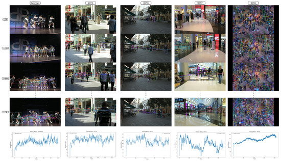 Qualitative trajectory tracking results of ReTrackVLM on DanceTrack, MOT15, MOT16, MOT17, and MOT20 datasets. For each dataset, trajectories are visualized at t = 1, t = 100, t = 200, and t = N, with N representing the total frame count (except for MOT20, where t = N is excluded due to excessive overlap). Below the visualizations, the number of tracks per frame is plotted, reflecting the session’s complexity and total duration.