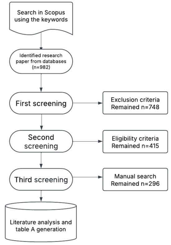 Due to the large number of articles retrieved from the Scopus database based on the selected keywords, the scope of the search results was narrowed using a process that evaluated the results based on eligibility and exclusion criteria. For the initial screening (first screening), exclusion criteria were applied, as shown in Table 2. The purpose of the exclusion criteria was to reject articles that were irrelevant to the topic from the outset.