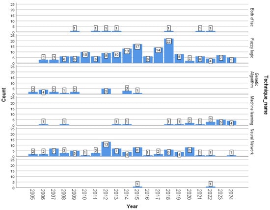Subsequently, eligibility criteria were applied for a second filtering (second screening), as shown in Table 3. The ultimate goal of the eligibility criteria was to establish targeted filters to narrow the search results specifically to the topic of the literature review. Specifically, the following were retained: (a) articles that addressed at least one of the four techniques under examination (fuzzy logic, neural networks, genetic algorithms, and machine learning), (b) articles focused on workplace safety with an emphasis on humans, and (c) articles that referred to risk analysis related to human factors, excluding external factors such as material failure or wear.